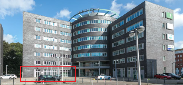 Links van de weg ligt Martiniplaza. Het meest rechtse gebouw op de foto is het gebouw van Martini Staete, de nieuwe locatie van studiecentrum Groningen. Rechts zie je de ingang van de parkeergarage.