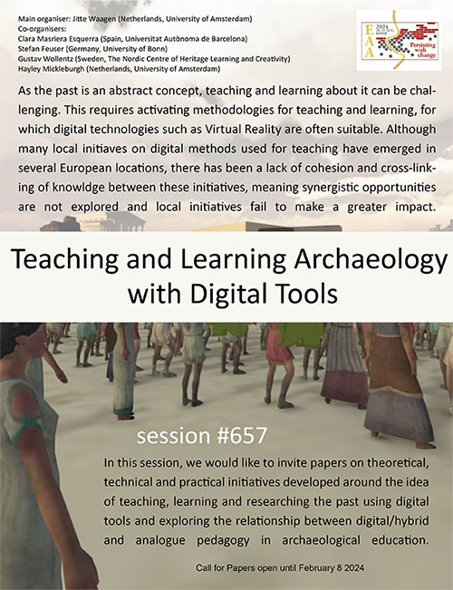 The Erasmus+ project Virtual Worlds in Teaching Archaeology co-organises the session #657 for the Conference EAA2024 of the European Association of Archaeologists (EAA) in August 2024 in Rome (Italy). In this session #657 we focus on archaeology, education (from pre-school to universities) and digital methods for teaching.