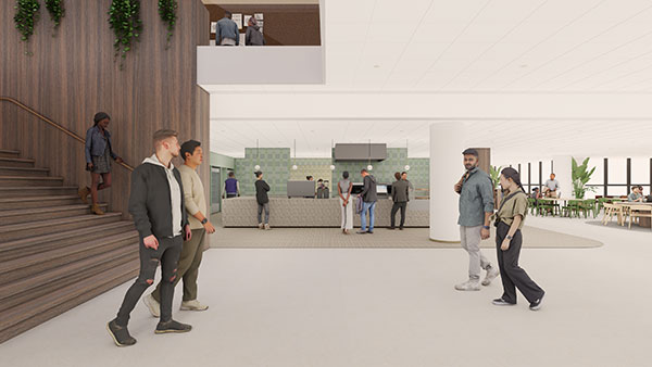 Op de tweede verdieping ligt een groot, sfeervol restaurant met ook weer werk- en studieplekken inclusief een dakterras dat uitkijkt over de binnenstad. Architect Peter Hagelaar: 'Dit wordt de centrale ontmoetingsplek voor studenten, bezoekers en medewerkers van alle partners die het doel van de campus verbeeldt: samenkomen, uitwisselen en groeien.'