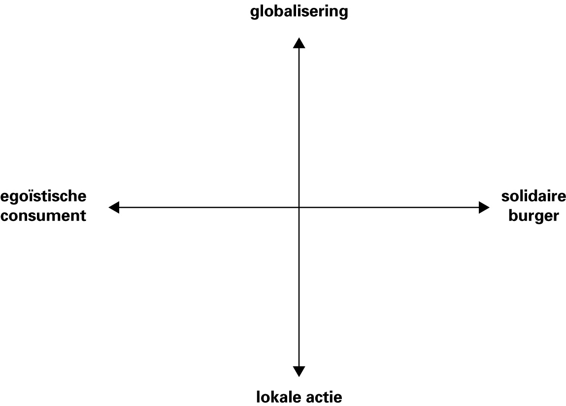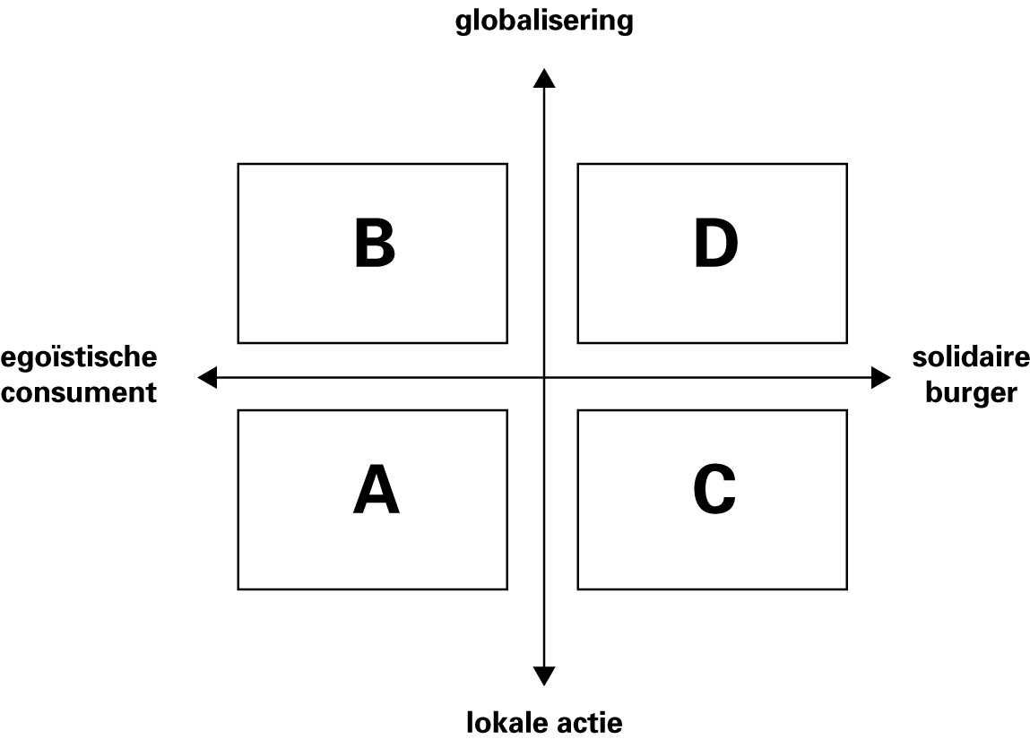 - personen die wèl een bijdrage willen leveren aan duurzame ontwikkeling (solidaire burger) staan voor de keus een bijdrage te leveren aan de verbetering van de eigen leefomgeving (kwadrant C: hier en nu), of een bijdrage te leveren aan de oplossing van duurzaamheidsproblemen elders in de wereld (kwadrant D: daar en later) door bijvoorbeeld hier en nu hun consumptiepatroon aan te passen.