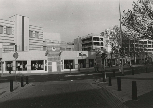 Winkelcentrum De Klomp gezien vanaf het Wilhelminaplein, 1988.