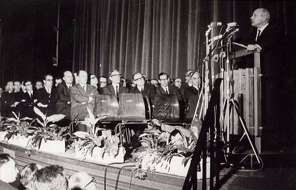 Minister Den Uyl in de Heerlense Stadsschouwburg in 1965.