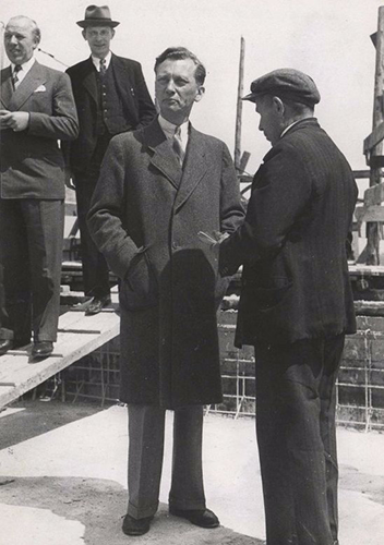 Peutz (met hoed) en Van Grunsven bezichtigen de bouw van het raadhuis in 1943.