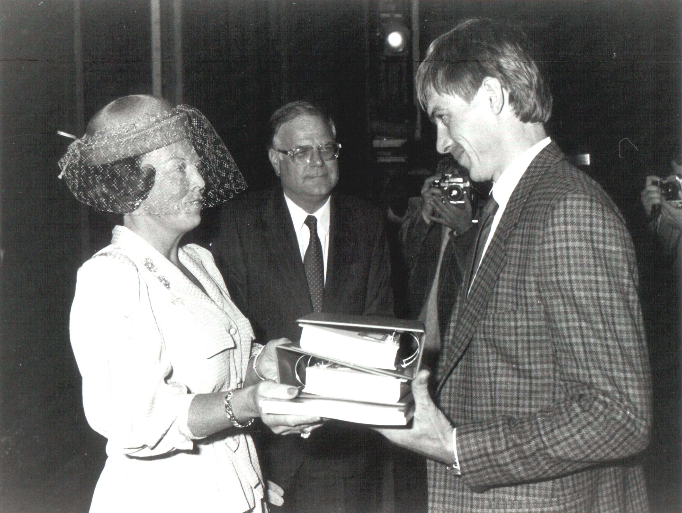 Foto: Koningin Beatrix overhandigt een cursuspakket aan een student. Bron: fotoarchief OU