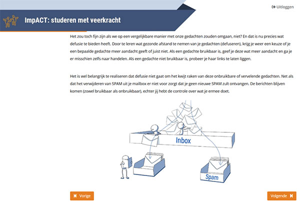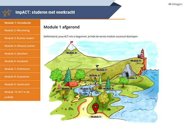 Als student ga je zelf ACTief aan de slag met allerlei oefeningen. Er zijn invul-oefeningen, doe-oefeningen, maar ook ervaringsgerichte oefeningen (audio) om je de ACT-vaardigheden eigen te maken en ze toe te kunnen passen in je dagelijks leven. Elke module wordt afgesloten met een korte samenvatting, waar de belangrijkste punten van de module aan bod komen. Onderstaand geven we per module een klein inkijkje in de training.